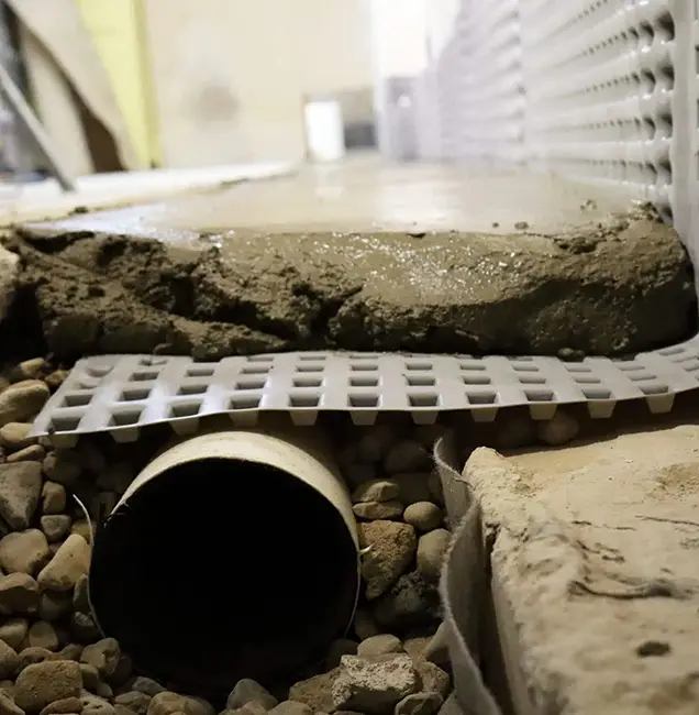 Interior French drains capture groundwater beneath the basement floor and redirect it toward a sump pump system.